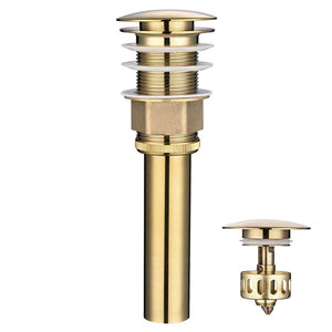 Aquaterior gold push-button style pop up drain without overflow, made of rustproof stainless steel and brass, is suitable for different types of vessel sinks without overflow. Built-in filter basket ensures less clogging of hair or debris and holds valuables safely.