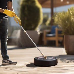 This 13 inch power washer floor scrubber attachment is suitable for pressure washers with 2500 PSI max working pressure and water flow rate up to 3 GPM. Featuring dual high-pressure rotating jets to provide quick cleaning, it is ideal for easily removing dirt and grime on large flat surfaces such as patios, driveways, sidewalks, etc.