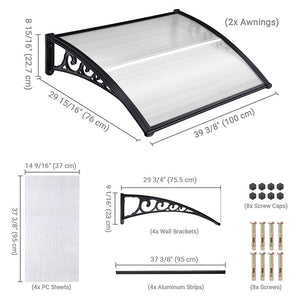 Trendtimes 3 foot Window Awning 2ct/pack is made with clear hollow polycarbonate sheet with UV protection and strong plastic & alloy brackets that can protect your entry doorway and windows. Poly Awning Canopy can easily be trimmed to your required width. Aks Door awning and Front porch awning which is designed for rain and moderate snow load, it can be used for residential and commercial applications. Awnings have good weather resistance, safe, easy and ready to install.