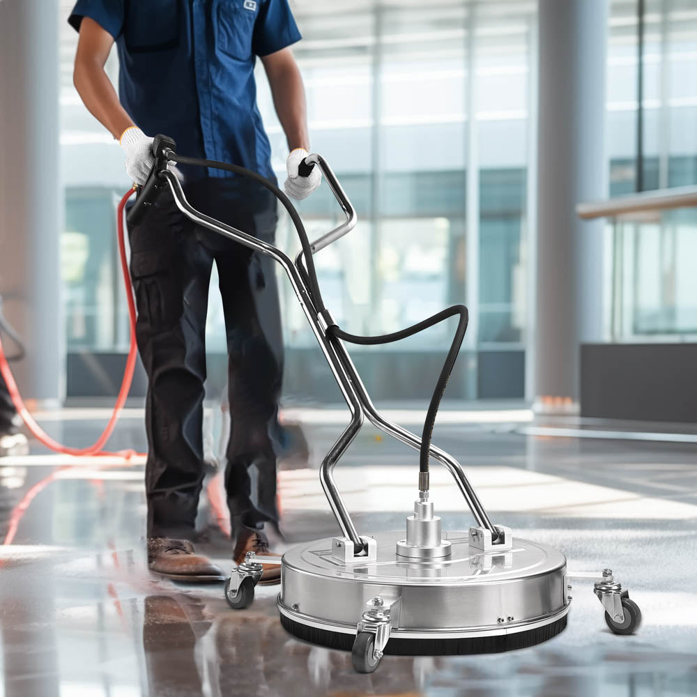 20 inch Surface Clearner with dual handle, hose and 4 rotating wheels, made of Stainless Steel with max working pressure up to 4500 PSI and water flow rate up to 8.6 GPM. Featuring dual high-pressure rotating jets to offer fast and powerful stream, ideal for cleaning stubborn stains on the surfaces of patios, driveways, sidewalks, etc.