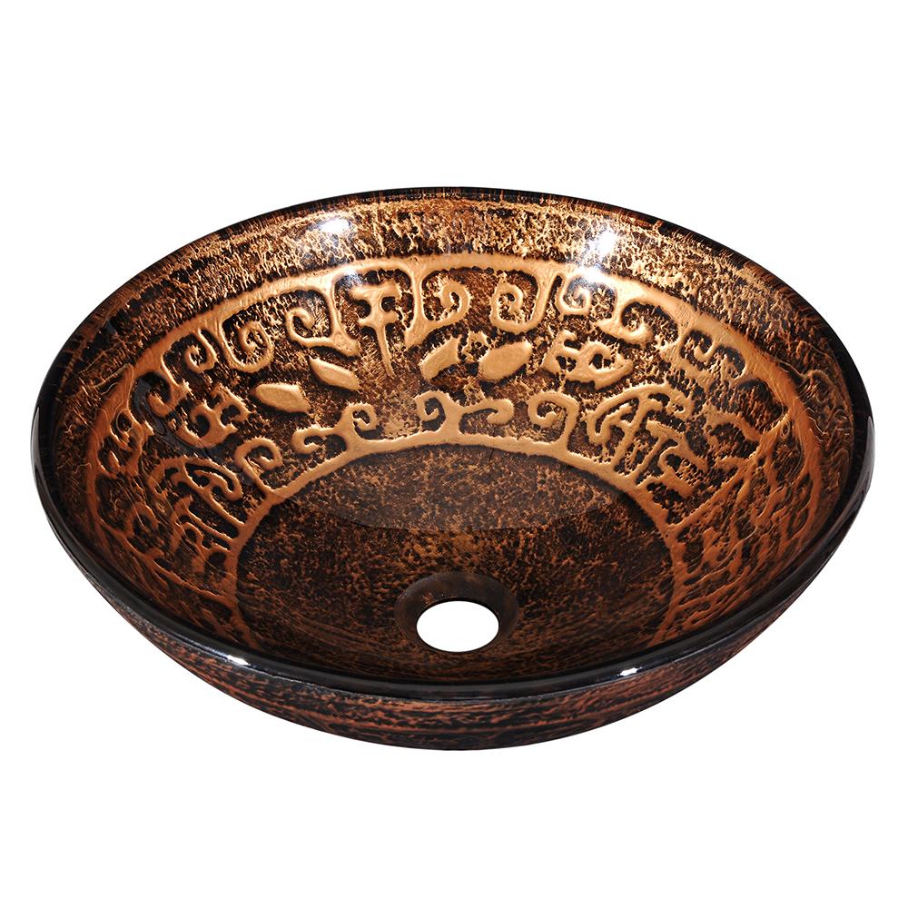 16 1/2" Dia. x 5 3/4" H Round Tempered Glass Vessel Sink Basin Bowl with Antique Totem Pattern Decor includes 1 3/4" Dia. Drain Hole. It features glossy glass interior, scratch resistant and easy to clean up. Installation type is countertop.
