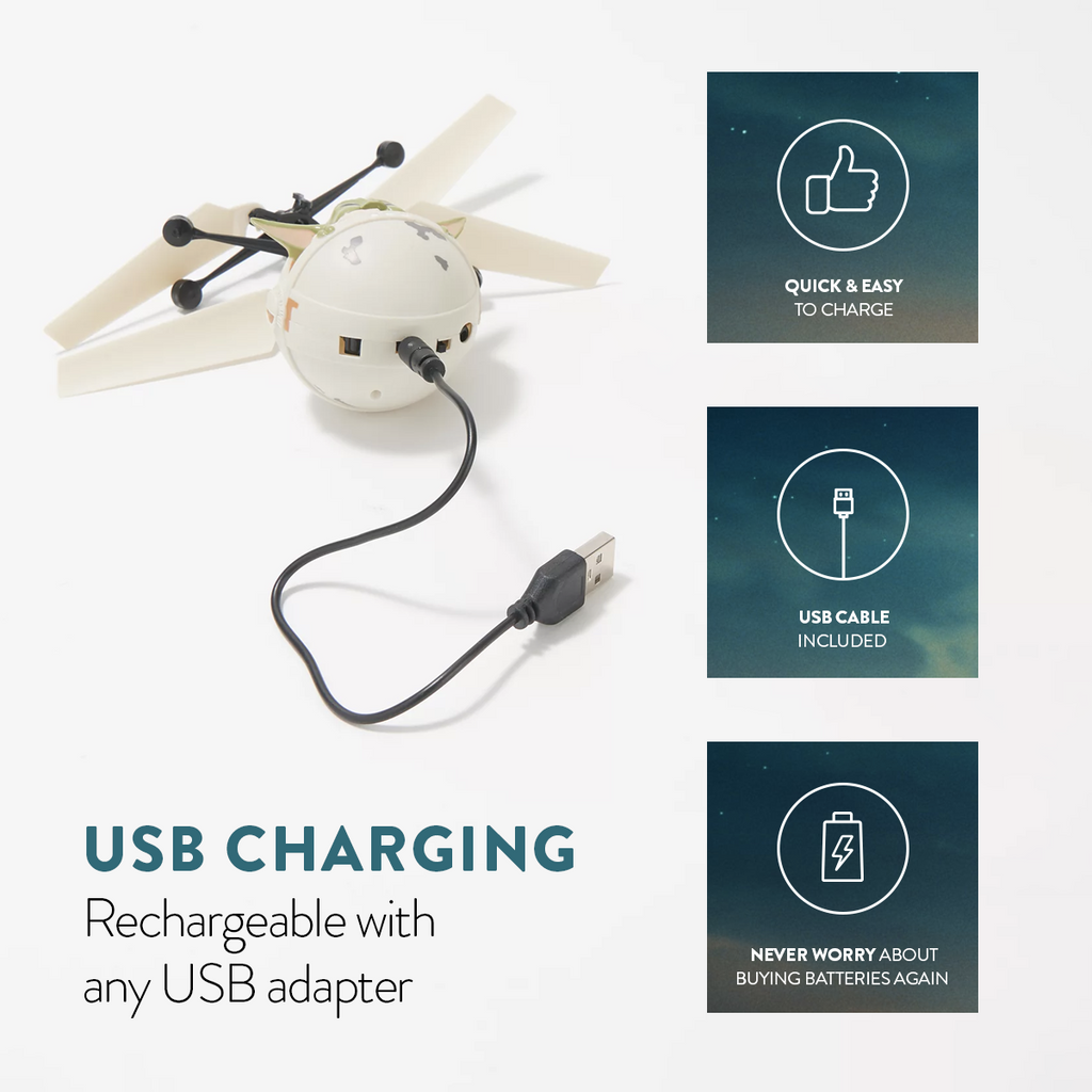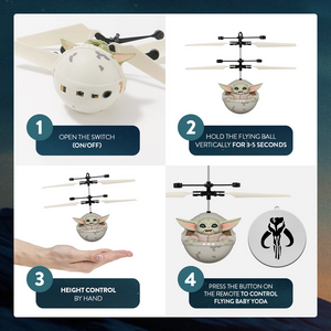 Watch as it flies over your hand for hand-eye coordination and motor skills! Baby Yoda is easy to fly and has no complicated controls, is made of lightweight metal is durable and safe and automatically avoids walls, pets and other objects with advanced Infrared Autopilot.